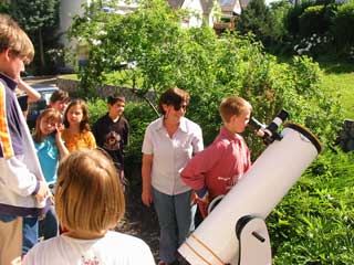 Dann Frau Metzler mit der 3.Klasse der Grundschule. Vier Fotografen des Presse versuchen ihr Glück, durch die Okulare zu fotografieren. Später noch weitere Klassen, auch eine von Fessenbach. |