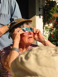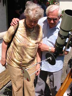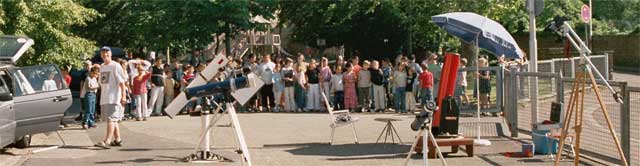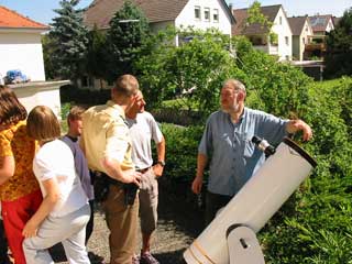 Auch die Polizei kommt vorbei, zum Vergnügen der Kinder ( wer darf mal in Handschellen ...?) 12h: Studenten der FH, Nachbarn. Gerhard und ich haben alle Hände voll zu tun um die Dobsons nachzurichten und tausend Fragen zu beantworten. 13h wird es spannend: die letzte Strecke der Venus, die auch in der Sofi-Brille gut zu sehen ist. Jeder kriegt sein Plätzchen zum letzten Kontakt und dann geht's ganz schnell... Wir schätzen die Zahl der Besucher auf 200. Stimmung abgehoben vom Alltag und die Gespräche fast schon philosofisch... |