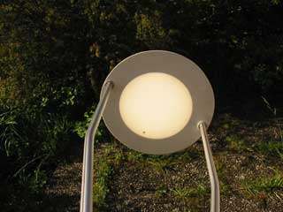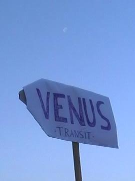und mit der interessierten aber instrumentenlosen Menschheit das Ereignis teilen? Heraus kam schliesslich ein Kompromiss. Noch am Sonntag waren wir durch Lahr gezogen, und schliesslich auch auf den Langenhard, bewaffnet mit Vemessungsgerät und Kommpass zum Ermitteln des besten Standortes. Wir enschieden uns dazu, den Eintritt auf dem Berg zu geniessen, und uns ab 10 Uhr im Hof der Lahrer Eichrodt-Grundschule einzufinden. Beim montäglichen Anruf für ein OK der Schule rannten wir offene Türen ein (Euphorie!). Wir hatten beide noch etwas Hektik am Montag; Alis bastelte einen neuen Folienfilter und ich fertigte noch schnell ein paar AVO-Flyer und -Plakate an und informierte die Presse. Für alle Fälle hatten wir noch dieses kleine Hinweisschild aufgestellt. Wie man sieht war auch der Mond noch anwesend - diesmal nicht der Hauptdarsteller. |