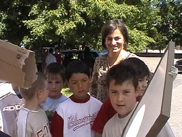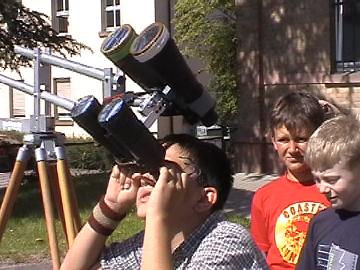 Es geht los. Die Lehrer/Innen haben ihre Schützlinge schon zuvor kurz vorbereitet, aber dennoch halten Alis und ich abwechselnd einen Mikrovortag vor versammelter Klasse, und überreichen die beiden grossen übrigen Folienfilter zum erstmal-so-durchgucken (Dobser auf den Folien, erfahren wir, sind unvermeidlich :-( ). Jener Hauch von Entdeckungsfreude ist zu spüren den wir ja selbst alle kennen und uns bewahrt haben. So klein ist die Venus? Aber doch so gross wie die Erde? Ich glaube bei manch einem Kind kam heute zum ersten Mal überhaupt diese Anhnung von der eigenen Winzigkeit auf. Ich habe oft Erwachsene leicht enttäuscht erlebt, wenn sie z.B. erfahren dass Sterne auch im Teleskop Punkte bleiben. Punkte, nur Punkte! Und jetzt? Ein schwarzer Fleck, und sonst nichts? Bei den Kindern aber kommt Begeisterung auf. |