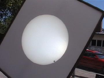 Zweite Station, der Projektionsschirm am TAL. Überaschend gut ist alles zu sehen: Unser Schwesterplanet, die Sonnenflecken, die Fackeln, die Randabschattung der Sonne, und sogar die Granulation wird sichtbar, wenn man leicht am Schirm herumwackelt! Rechts sieht man Venus bereits beim dritten Kontakt, und wer genau hinsieht kann sogar das grosse Fackelgebiet links von Venus erkennen. |