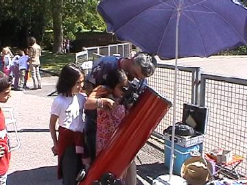 Der hässliche Karton links am Okular war notwendig geworden, weil einige Kinder gefährlich nah ans Okular kamen. Später, als einmal weniger los war, konnte wir etwas etwas Eindruck machen, indem wir einen Teil davon mit Sonnenenergie mutwillig abgefackelt haben um die Gefährlichkeit zu demonstrieren. |