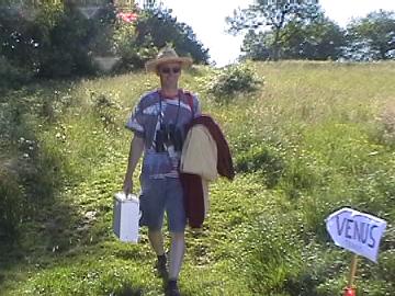 von Venus unbeeindruckt, auf den schwarzen Asphalt. Schliesslich hat das TAL seinen Projektionsschirm, das DOB steht auf der Kiste, die beiden 70/700er (mit und ohne Spiegel) haben ihre Okulare, Alis' Fernglasmontierung ist zusammengeschraubt, und auch der Computer ist ausgepackt. |